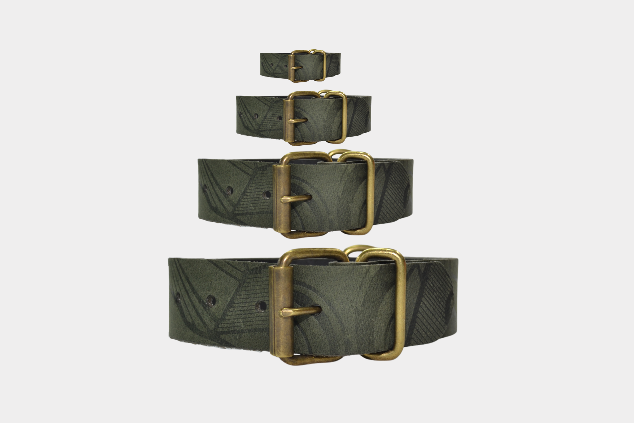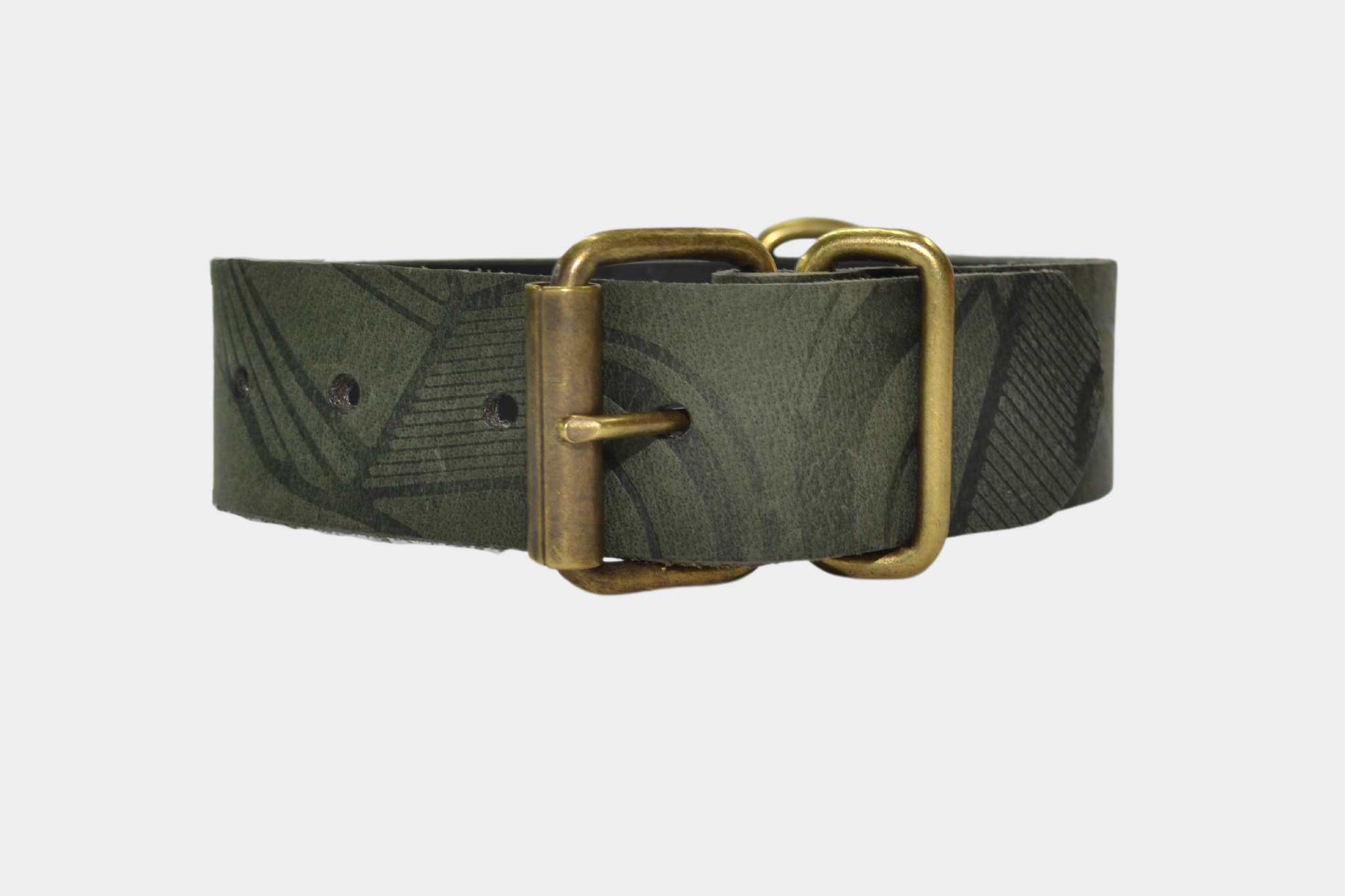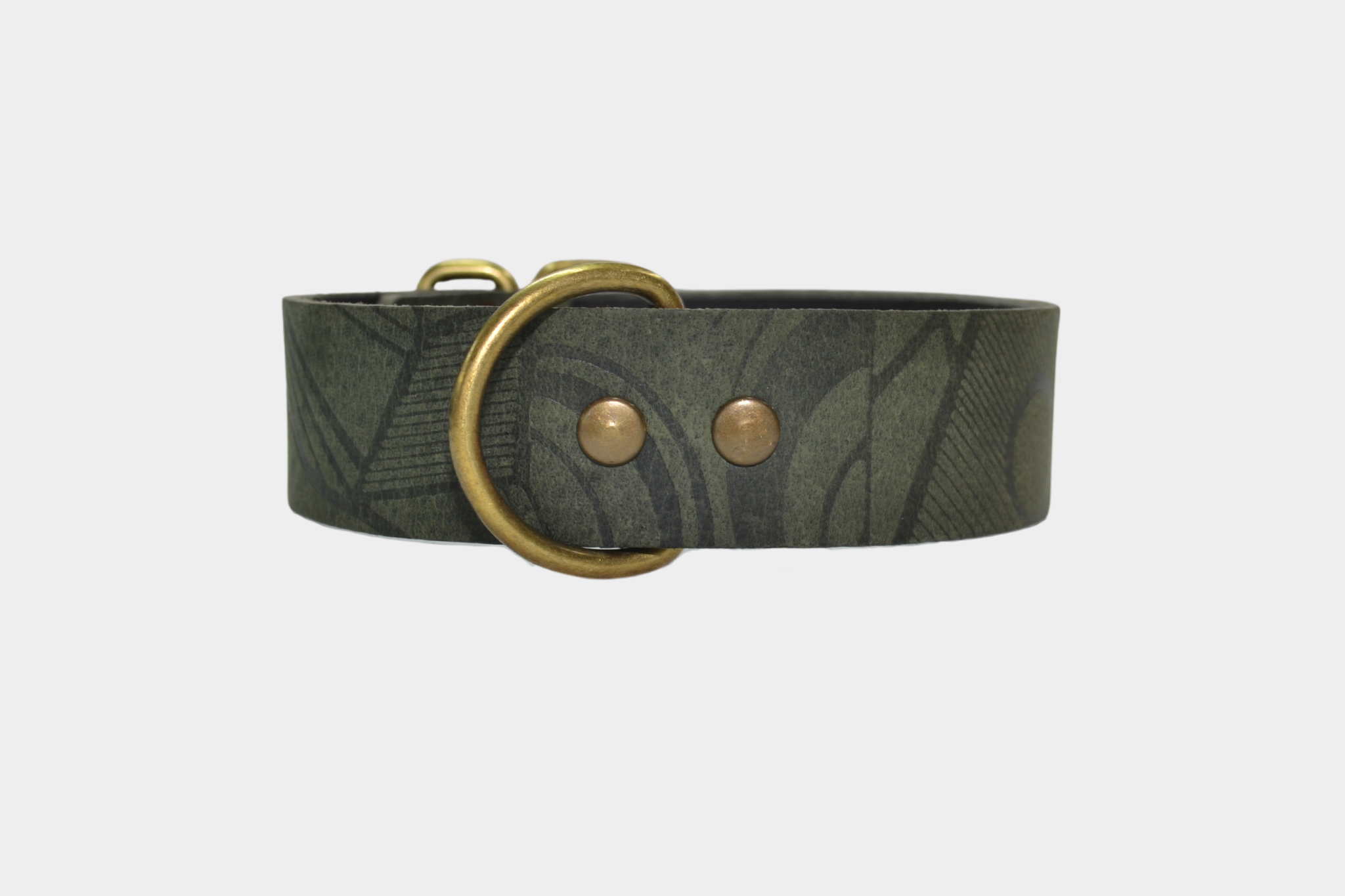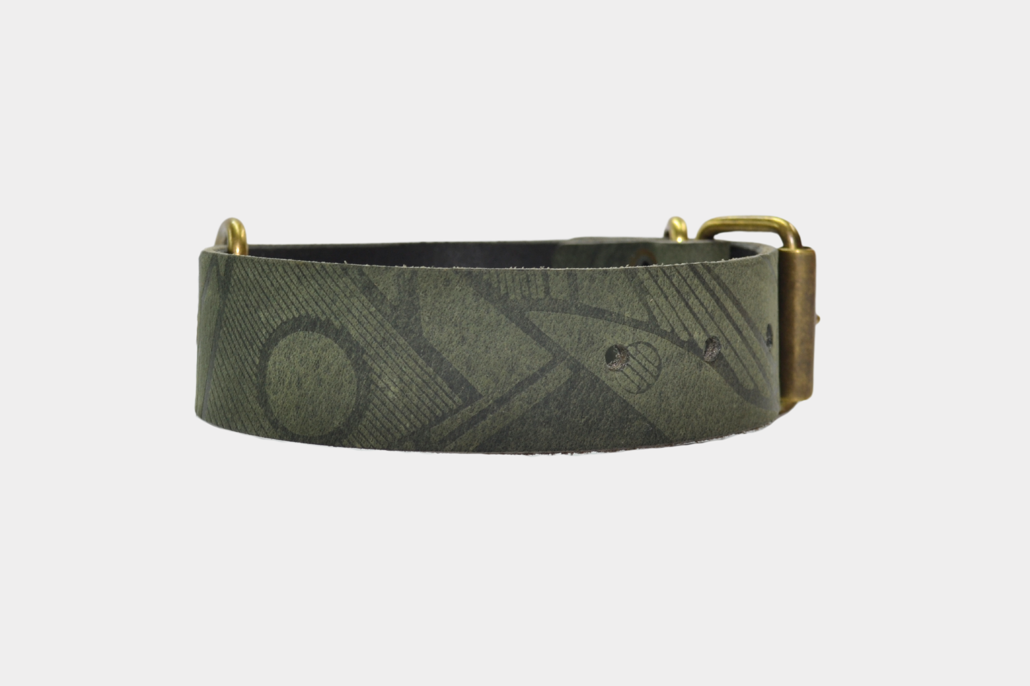 De halsband is gemaakt van buffelleer met een gefreesde, wasachtige pull-up afwerking in een substantie van 3,2-3,5 mm en is voorzien van een stevig gesp, passant en d-ring in een oud goud kleur. Verder is de halsband voorzien van een print.